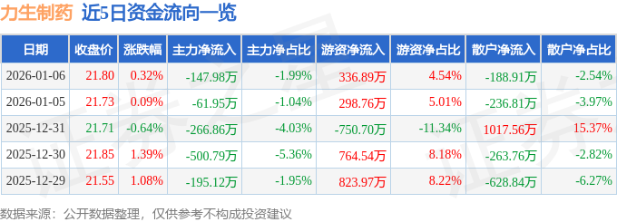证券之星消息,截至2026年1月6日收盘,力生制药(002393)报收于21.8元,上涨0.32%,换手率1.36%,成交量3.4万手,成交额7426.75万元。