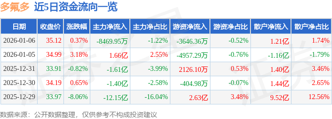 证券之星消息,截至2026年1月6日收盘,多氟多(002407)报收于35.12元,上涨0.37%,换手率18.24%,成交量197.11万手,成交额69.66亿元。