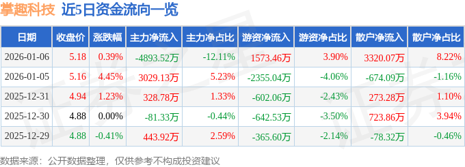 证券之星消息,截至2026年1月6日收盘,掌趣科技(300315)报收于5.18元,上涨0.39%,换手率3.03%,成交量78.17万手,成交额4.04亿元。