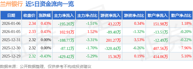 证券之星消息,截至2026年1月6日收盘,兰州银行(001227)报收于2.34元,上涨0.43%,换手率1.31%,成交量55.11万手,成交额1.29亿元。