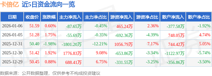 证券之星消息,截至2026年1月6日收盘,卡倍亿(300863)报收于51.59元,上涨0.6%,换手率2.09%,成交量3.77万手,成交额1.97亿元。
