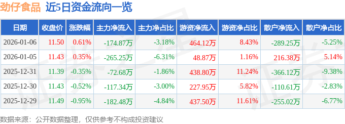 证券之星消息,截至2026年1月6日收盘,劲仔食品(003000)报收于11.5元,上涨0.61%,换手率1.6%,成交量4.81万手,成交额5506.44万元。