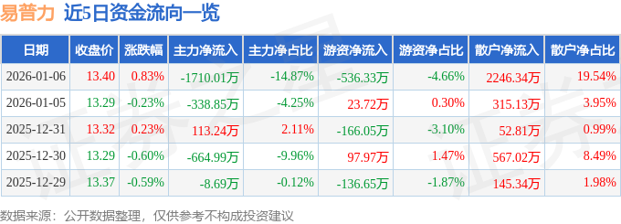 1月6日的资金流向数据方面,主力资金净流出1710.01万元,占总成交额14.87%,游资资金净流出536.33万元,占总成交额4.66%,散户资金净流入2246.34万元,占总成交额19.54%。