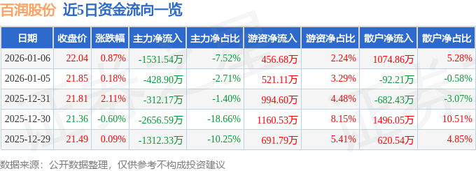 证券之星消息,截至2026年1月6日收盘,百润股份(002568)报收于22.04元,上涨0.87%,换手率1.29%,成交量9.31万手,成交额2.04亿元。