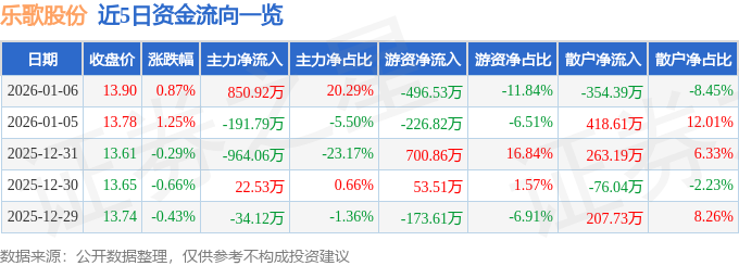 证券之星消息,截至2026年1月6日收盘,乐歌股份(300729)报收于13.9元,上涨0.87%,换手率0.95%,成交量3.02万手,成交额4192.92万元。