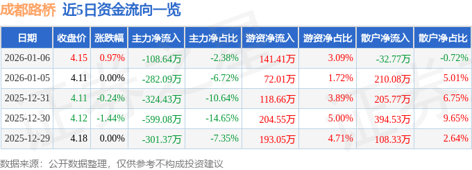 证券之星消息,截至2026年1月6日收盘,成都路桥(002628)报收于4.15元,上涨0.97%,换手率1.47%,成交量11.05万手,成交额4571.93万元。