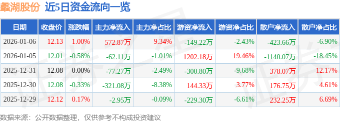 1月6日的资金流向数据方面,主力资金净流入572.87万元,占总成交额9.34%,游资资金净流出149.22万元,占总成交额2.43%,散户资金净流出423.66万元,占总成交额6.9%。