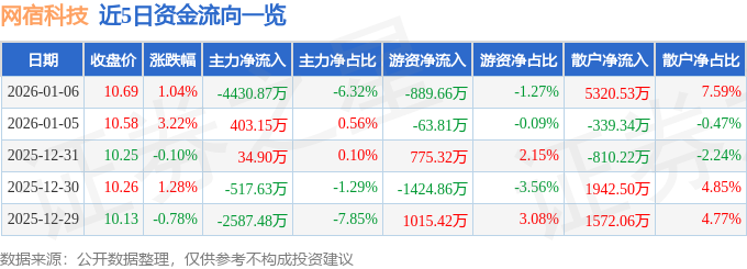 证券之星消息,截至2026年1月6日收盘,网宿科技(300017)报收于10.69元,上涨1.04%,换手率2.85%,成交量65.84万手,成交额7.01亿元。