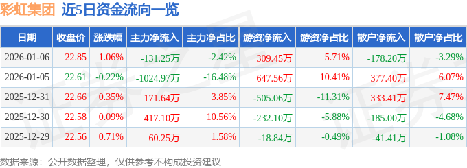 证券之星消息,截至2026年1月6日收盘,彩虹集团(003023)报收于22.85元,上涨1.06%,换手率2.25%,成交量2.36万手,成交额5418.67万元。