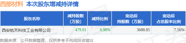 证券之星消息,1月6日西部材料发布公告《西部材料:关于持股5%以上股东权益变动触及1%整数倍的公告》,其股东西安航天科技工业有限公司于2026年1月5日合计减持479.91万股,占公司目前总股本的0.983%,变动期间该股股价上涨1.14%,截止1月5日收盘报46.03元。