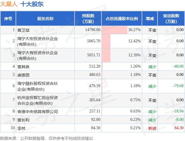 证券之星消息,1月6日火星人发布公告《火星人:关于控股股东、实际控制人的一致行动人减持股份进展暨权益变动触及1%的提示性公告》,其股东舟山大星企业管理咨询合伙企业(有限合伙)、舟山大宏企业管理咨询合伙企业(有限合伙)于2026年1月5日合计减持298.7万股,占公司目前总股本的0.7352%,变动期间该股股价上涨6.02%,截止1月5日收盘报12.5元。