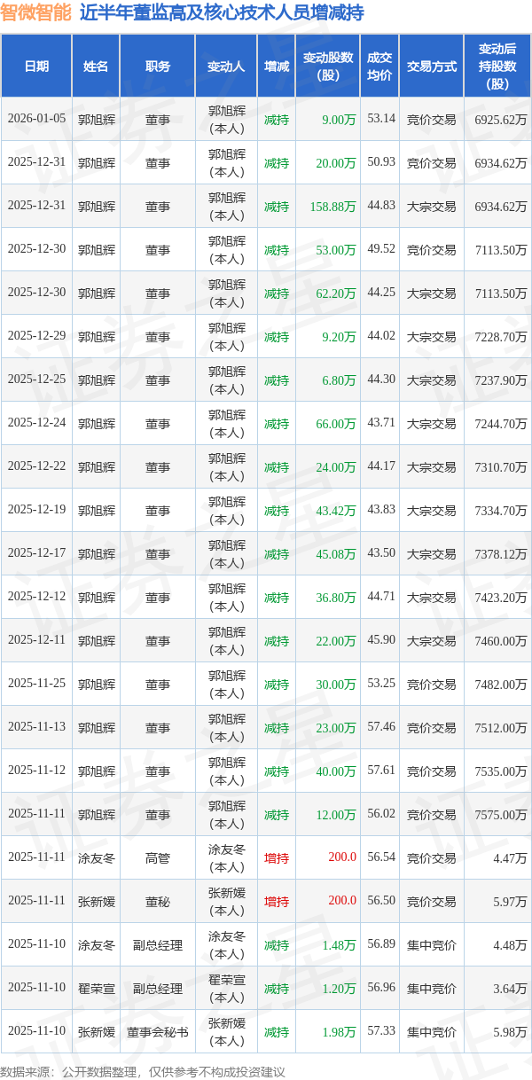 智微智能近半年内的董监高及核心技术人员增减持详情如下: