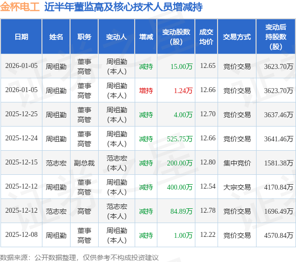 金杯电工近半年内的董监高及核心技术人员增减持详情如下:
