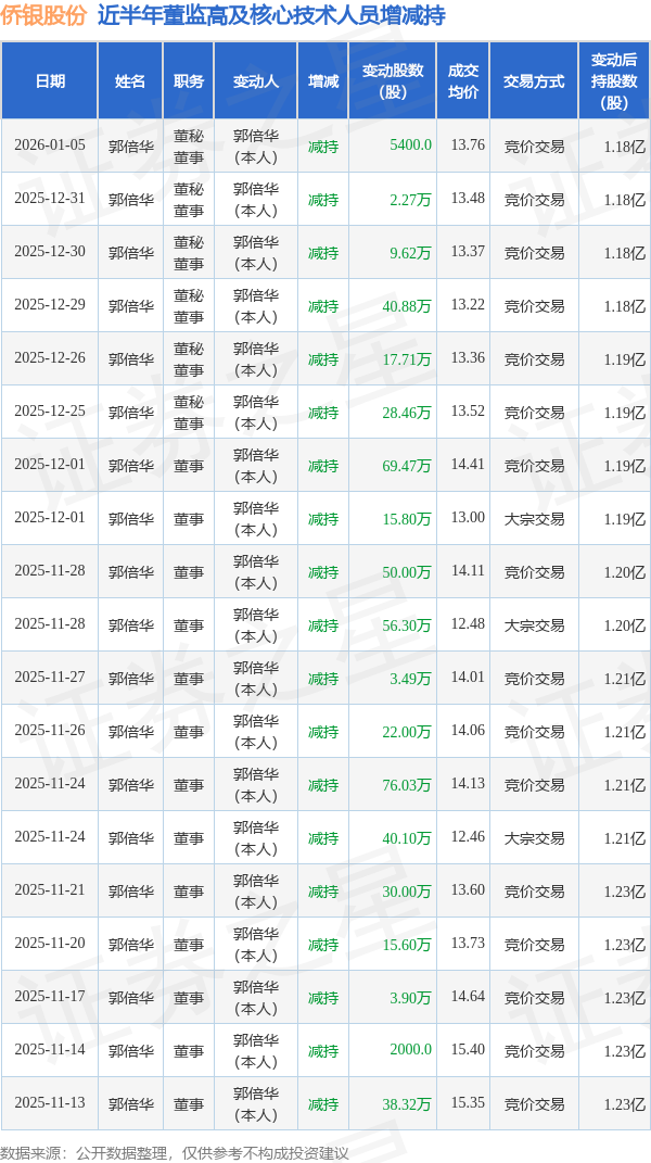 侨银股份近半年内的董监高及核心技术人员增减持详情如下: