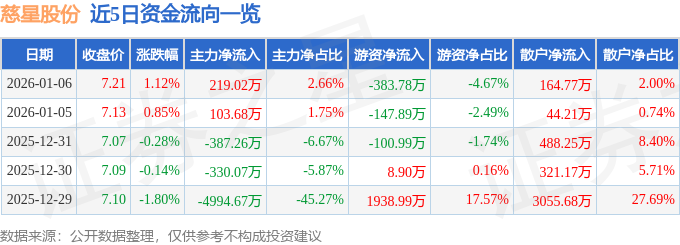 证券之星消息,截至2026年1月6日收盘,慈星股份(300307)报收于7.21元,上涨1.12%,换手率1.45%,成交量11.46万手,成交额8218.88万元。