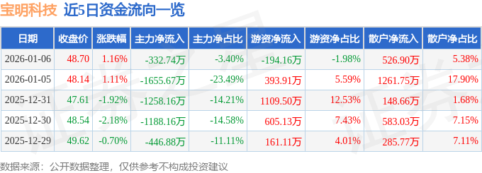 证券之星消息,截至2026年1月6日收盘,宝明科技(002992)报收于48.7元,上涨1.16%,换手率1.28%,成交量2.02万手,成交额9796.08万元。