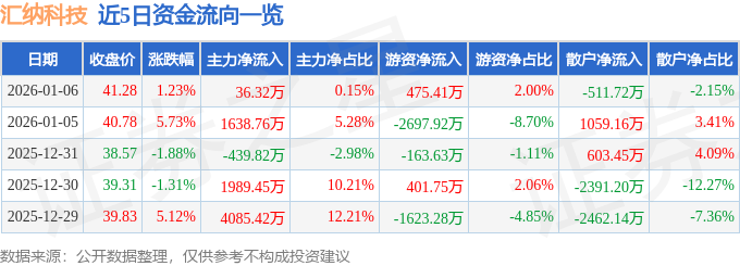 证券之星消息,截至2026年1月6日收盘,汇纳科技(300609)报收于41.28元,上涨1.23%,换手率4.82%,成交量5.78万手,成交额2.38亿元。