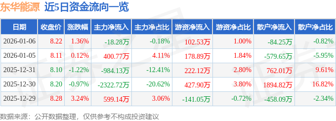 证券之星消息,截至2026年1月6日收盘,东华能源(002221)报收于8.22元,上涨1.36%,换手率0.86%,成交量12.61万手,成交额1.03亿元。
