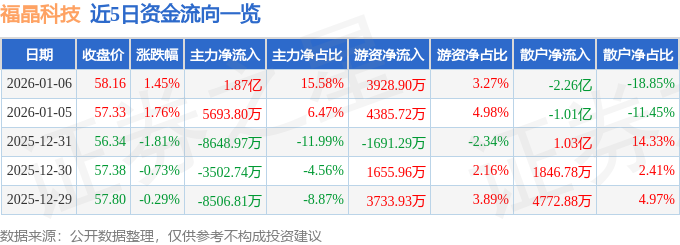 1月6日的资金流向数据方面,主力资金净流入1.87亿元,占总成交额15.58%,游资资金净流入3928.9万元,占总成交额3.27%,散户资金净流出2.26亿元,占总成交额18.85%。