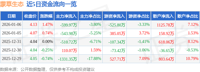 证券之星消息,截至2026年1月6日收盘,蒙草生态(300355)报收于4.13元,上涨1.47%,换手率2.96%,成交量38.5万手,成交额1.58亿元。