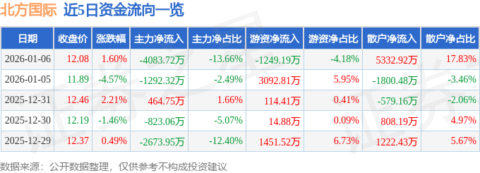 证券之星消息,截至2026年1月6日收盘,北方国际(000065)报收于12.08元,上涨1.6%,换手率2.55%,成交量24.82万手,成交额2.99亿元。