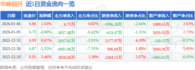 证券之星消息,截至2026年1月6日收盘,华峰超纤(300180)报收于6.86元,上涨1.63%,换手率3.55%,成交量60.88万手,成交额4.15亿元。