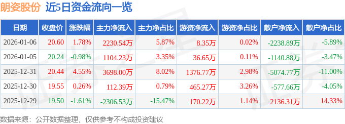 1月6日的资金流向数据方面,主力资金净流入2230.54万元,占总成交额5.87%,游资资金净流入8.35万元,占总成交额0.02%,散户资金净流出2238.89万元,占总成交额5.89%。