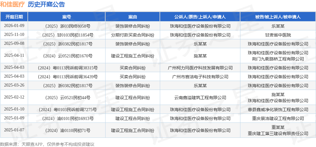 案号:(2025)浙03民终8058号根据统计,近一年内以珠海和佳医疗设备股份有限公司为当事人的历史开庭公告有11则,其中案由为“建设工程施工合同纠纷”的公告以3则居首,其次为“装饰装修合同纠纷”有3则,“买卖合同纠纷”有2则。历史开庭公告如下: