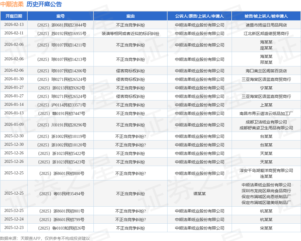 案号:(2025)川0191民初28296号根据统计,近一年内以中顺洁柔纸业股份有限公司为当事人的历史开庭公告有293则,其中案由为“不正当竞争纠纷”的公告以211则居首,其次为“侵害商标权纠纷”有34则,“擅自使用与他人有一定影响的商品名称、包装、装潢等相同或者近似的标识纠纷”有24则。历史开庭公告(前20条)如下: