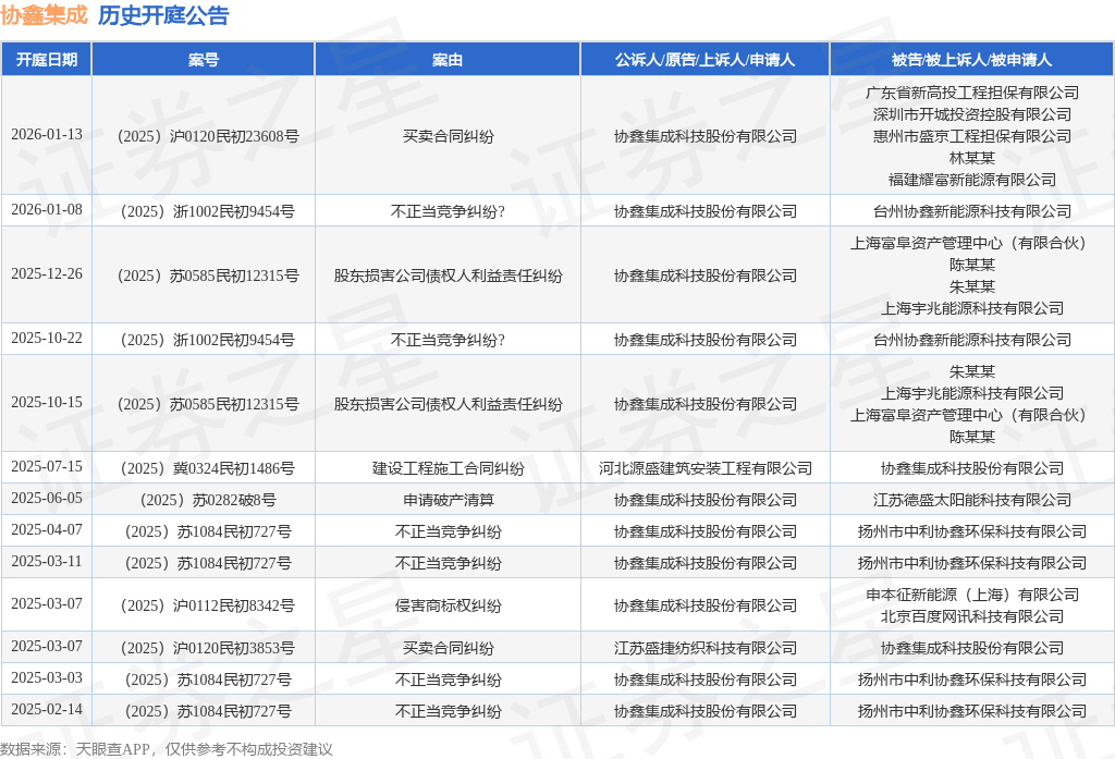 案号:(2025)浙1002民初9454号根据统计,近一年内以协鑫集成科技股份有限公司为当事人的历史开庭公告有13则,其中案由为“不正当竞争纠纷”的公告以4则居首,其次为“不正当竞争纠纷?”有2则,“买卖合同纠纷”有2则。历史开庭公告如下: