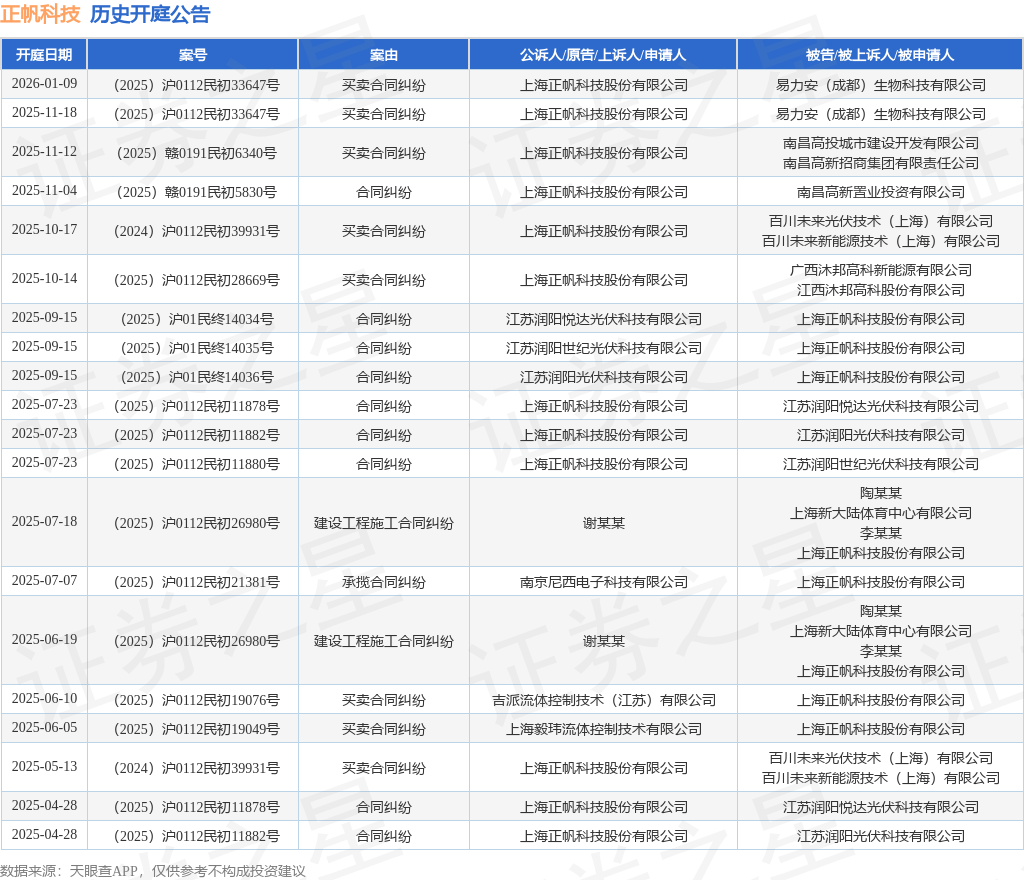 案号:(2025)沪0112民初33647号根据统计,近一年内以上海正帆科技股份有限公司为当事人的历史开庭公告有35则,其中案由为“买卖合同纠纷”的公告以14则居首,其次为“合同纠纷”有10则,“承揽合同纠纷”有6则。历史开庭公告(前20条)如下: