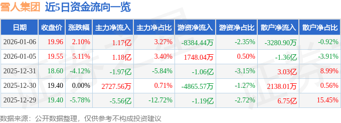 证券之星消息,截至2026年1月6日收盘,雪人集团(002639)报收于19.96元,上涨2.1%,换手率27.72%,成交量180.33万手,成交额35.65亿元。