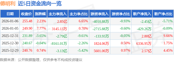 1月6日的资金流向数据方面,主力资金净流入2.85亿元,占总成交额6.65%,游资资金净流出4010.88万元,占总成交额0.93%,散户资金净流出2.45亿元,占总成交额5.71%。