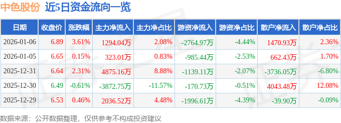 证券之星消息,截至2026年1月6日收盘,中色股份(000758)报收于6.89元,上涨3.61%,换手率4.59%,成交量90.76万手,成交额6.22亿元。