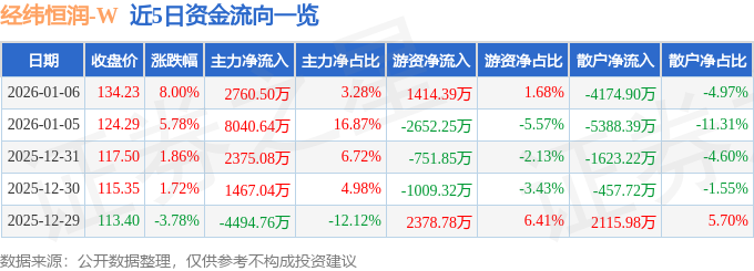 1月6日的资金流向数据方面,主力资金净流入2760.5万元,占总成交额3.28%,游资资金净流入1414.39万元,占总成交额1.68%,散户资金净流出4174.9万元,占总成交额4.97%。