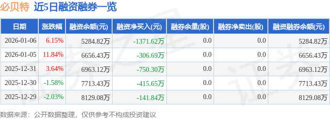 必贝特融资融券信息显示,融资方面,当日融资买入763.95万元,融资偿还2135.57万元,融资净偿还1371.62万元。融券方面,融券卖出0.0股,融券偿还0.0股,融券余量0.0股,融券余额0.0万元。融资融券余额5284.82万元。