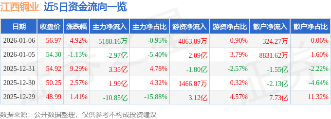 证券之星消息,截至2026年1月6日收盘,江西铜业(600362)报收于56.97元,上涨4.92%,换手率4.68%,成交量97.22万手,成交额54.33亿元。