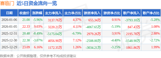 证券之星消息,截至2026年1月6日收盘,喜临门(603008)报收于21.0元,下跌5.96%,换手率9.24%,成交量34.03万手,成交额7.19亿元。