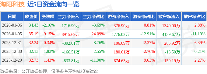 证券之星消息,截至2026年1月6日收盘,海阳科技(603382)报收于34.43元,下跌2.16%,换手率35.62%,成交量12.91万手,成交额4.65亿元。