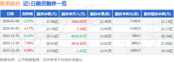 新泉股份融资融券信息显示,融资方面,当日融资买入2.08亿元,融资偿还1.51亿元,融资净买入5684.6万元。融券方面,融券卖出1500.0股,融券偿还8600.0股,融券余量22.98万股,融券余额1732.69万元。融资融券余额22.13亿元。