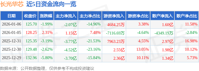 证券之星消息,截至2026年1月6日收盘,长光华芯(688048)报收于125.7元,下跌1.99%,换手率6.25%,成交量11.01万手,成交额13.85亿元。