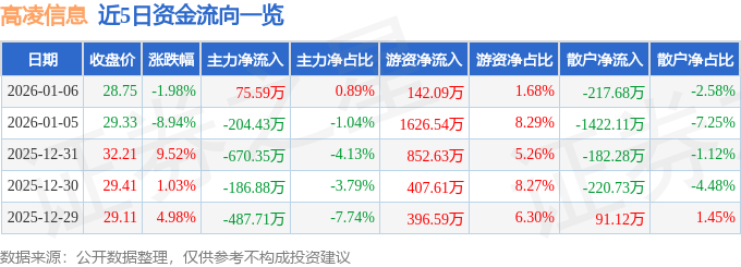 证券之星消息,截至2026年1月6日收盘,高凌信息(688175)报收于28.75元,下跌1.98%,换手率2.25%,成交量2.91万手,成交额8448.34万元。