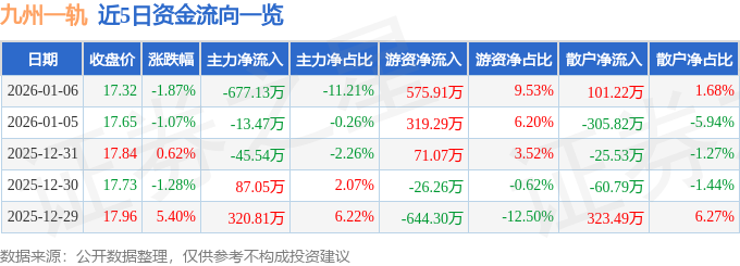 1月6日的资金流向数据方面,主力资金净流出677.13万元,占总成交额11.21%,游资资金净流入575.91万元,占总成交额9.53%,散户资金净流入101.22万元,占总成交额1.68%。