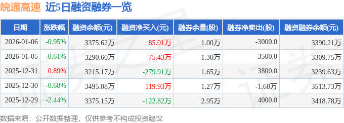 证券之星消息,截至2026年1月6日收盘,皖通高速(600012)报收于14.59元,下跌0.95%,换手率0.46%,成交量5.36万手,成交额7800.17万元。