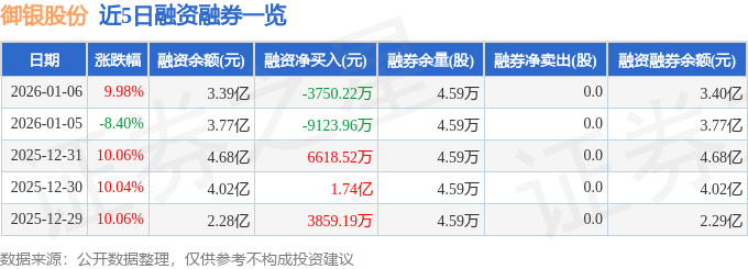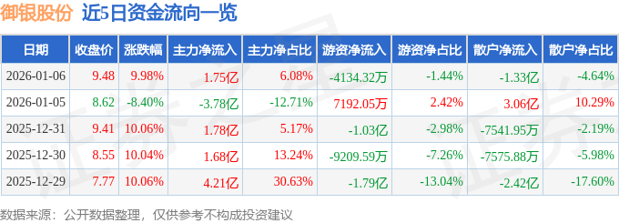 证券之星消息,截至2026年1月6日收盘,御银股份(002177)报收于9.48元,上涨9.98%,涨停,换手率47.71%,成交量322.02万手,成交额28.75亿元。