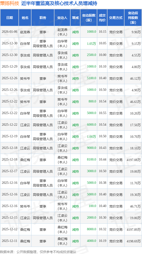 证券之星消息,根据1月7日市场公开信息、上市公司公告及交易所披露数据整理,秉扬科技(920675)最新董监高及相关人员股份变动情况:2026年1月6日公司董事赵龙善共减持公司股份1000.0股,占公司总股本为0.0006%。变动期间公司股价上涨1.6%,1月6日当日收盘报10.14元。
