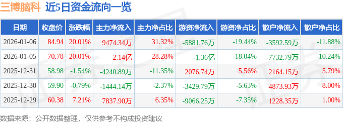 1月6日的资金流向数据方面,主力资金净流入9474.34万元,占总成交额31.32%,游资资金净流出5881.76万元,占总成交额19.44%,散户资金净流出3592.59万元,占总成交额11.88%。