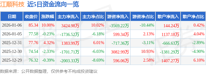 证券之星消息,截至2026年1月6日收盘,江顺科技(001400)报收于85.34元,上涨10.0%,涨停,换手率27.68%,成交量4.15万手,成交额3.42亿元。