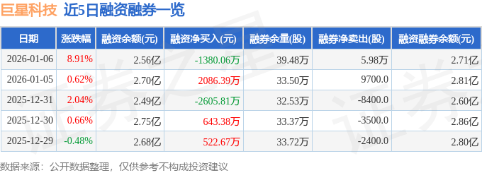 巨星科技融资融券信息显示,融资方面,当日融资买入3064.17万元,融资偿还4444.22万元,融资净偿还1380.06万元。融券方面,融券卖出6.1万股,融券偿还1200.0股,融券余量39.48万股,融券余额1471.81万元。融资融券余额2.71亿元。