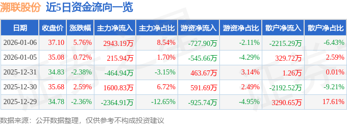 证券之星消息,截至2026年1月6日收盘,溯联股份(301397)报收于37.1元,上涨5.76%,换手率13.55%,成交量9.58万手,成交额3.45亿元。